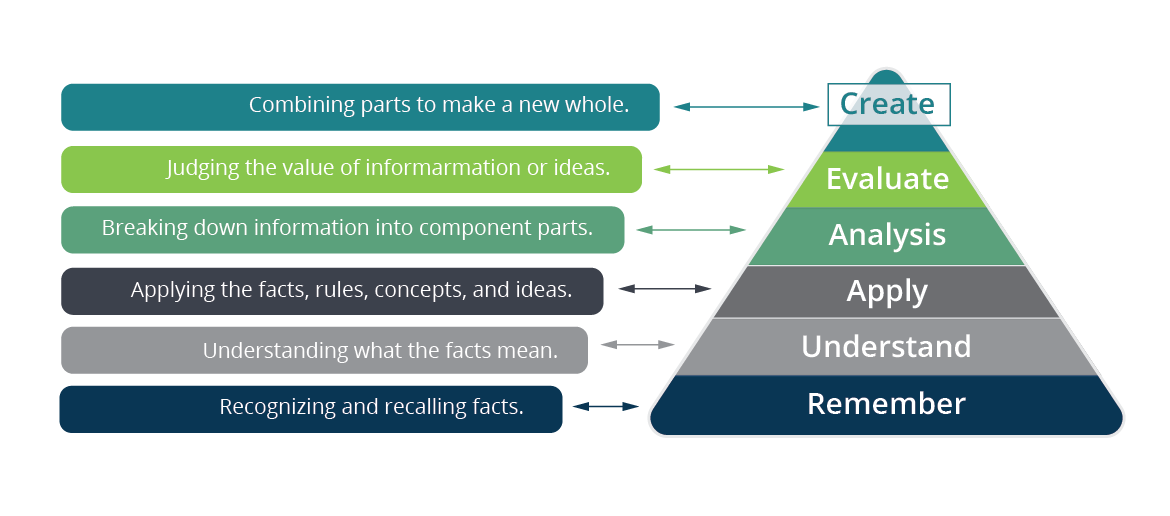 The action verbs used to create learning objectives can be grouped on the type of cognitive change you are aiming for in your activity. These changes can be thought of at different levels, as shown in this figure.